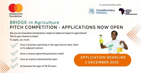 CALL FOR APPLICATIONS - BRIDGE-in Agriculture Pitch Competition Ghana’s next generation of agripreneurs is ready to make a significant impact. If your business is part of the agricultural value chain or its adjacent sector, apply now to grow your venture, increase your impact, and gain valuable support. Why apply? 🔹 Win up to $5,000 to help your business grow 🔹 Improve your operations and reach more customers 🔹 Get exposure for your innovation 🔹 Create meaningful jobs in your community Who can apply? You must: 🔹 Be involved in the agricultural value chain or its adjacent sector 🔹 Run a business that generates revenue 🔹 Have a clear plan focused on impact 🔹 Be between the ages of 18 - 35 years Apply here: https://lnkd.in/dS8_5B2n Deadline: 3 December 2025 Questions? Call 0307000111 / 0548288182. Take the first step. Your next chapter starts now! About BRIDGE-in Agriculture: BRIDGE-in Agriculture provides affordable capital and hands-on technical support to agricultural SMEs. The initiative also equips 400,000 young people, with a focus on 70% women and persons with disabilities, with the skills needed for dignified and fulfilling work....
